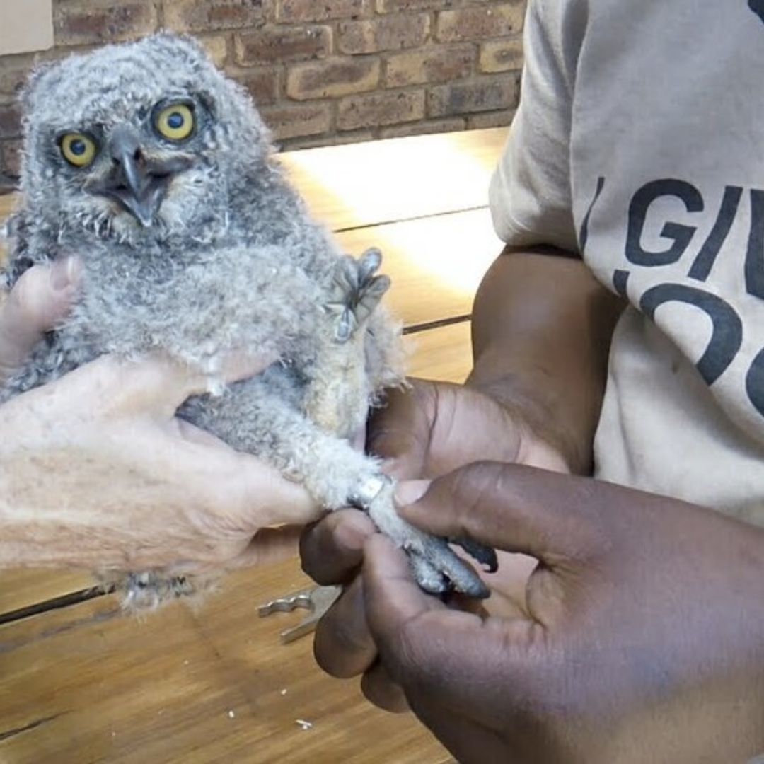 Spotted Eagle Owlet (Bubo africanus) being ringed in Honeydew